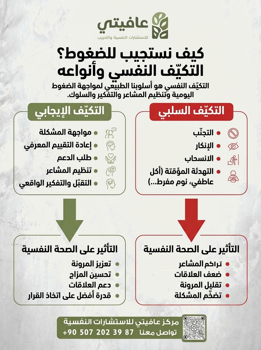 اكتشف كيف يساعد التكيّف النفسي في مواجهة الضغوط اليومية بطرق صحية، وتعرّف على أنواع التكيّف الإيجابي والسلبي، وأثرها على الصحة النفسية والجسدية، واستراتيجيات تعزيز المرونة النفسية للتعامل مع تحديات الحياة بثقة.